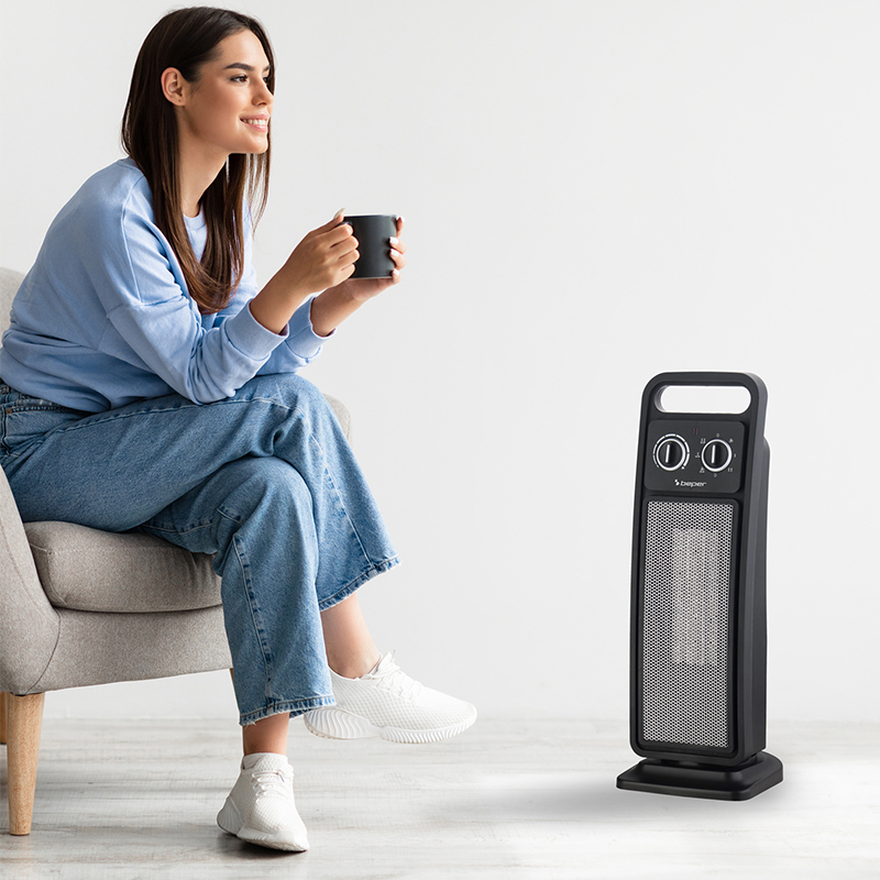 Aerotermă elegantă, cu ventilator tip turn, ideal pentru încălzirea locuinței.