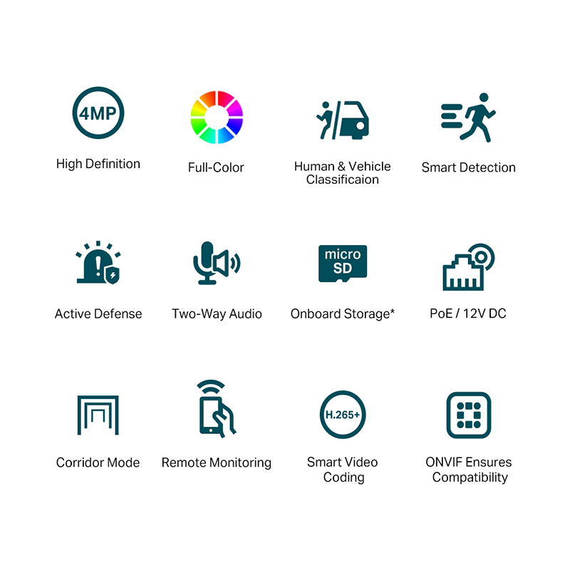Rezoluție 4MP HD: Cei 4 megapixeli oferă înregistrări video clare, la o rezoluție ridicată de până la 2560×1440. Full-Color: Prin senzorul high-sensivity și LED-urile integrate, se pot realiza înregistrări color chiar și în timpul nopții. Smart Detection: Camera VIGI dispune de capacități inteligente de detectare pentru mișcare, încălcarea perimetrului sau obstrucționarea camerei, trimițând notificări instant. Compresie video H.265+: Camera transmite înregistrări video de o calitate ridicată, comprimate pentru a economisi din spațiul de stocare și pentru a reduce din costurile de monitorizare, fără a afecta calitatea. Two-Way Audio: Permite comunicarea cu cei din fața camerei, prin microfonul și difuzorul integrate. Suport ONVIF3: Camera poate lucra alături de alte camere TP-Link VIGI, sau de la alți producători, pentru a crea o rețea performantă și versatilă. PoE/12V DC: Cele două opțiuni de alimentare oferă o flexibilitate mai mare pentru instalarea rețelelor de supraveghere. Control de la distanță: Aplicația TP-Link VIGI permite vizualizarea și managementul de la distanță a rețelei de supraveghere, direct de pe telefon sau tabletă. CAMERĂ Senzor Imagine: 1/3” Progressive Scan CMOS Shutter Speed: 1/3 to 1/10000 s Slow Shutter: Yes Iluminare Minimă: 0 lux cu IR/white Light Mecanism Zi/Noapte: IR Cut Filter Day/Night Switch: Unified/ Scheduled/ Auto Lentile: Lentile fixe (2.8 mm/4 mm) Aperture: 2.8 mm: F1.6 4 mm: F1.6 Lens Mount: M12 Unghi de Vizualizare (2.8 mm) FOV orizontal: 102° FOV vertical: 55° FOV diagonal: 122° (4 mm) FOV orizontal: 79° FOV vertical: 43° FOV diagonal: 93° Distanță Operare Infraroșu Până la 30 m Illumination Distance Până la 30 m Pan/Tilt Range Pan: între 0–360° Tilt: între 0–85° Digital Noise Reduction 3D DNR WDR: DWDR LENS Type: Fixed Focal Lens Focal Length: 2.8/4 mm Aperture: 2.8 mm: F1.6 4 mm: F1.6 FOV 2.8mm: Horizontal FOV: 102°, Vertical FOV: 55°, Diagonal FOV: 122° 4mm: Horizontal FOV: 79°, Vertical FOV: 43°, Diagonal FOV: 93° Lens Mount M12 DORI Distance 2.8 mm Detect: 64 m (209 ft) Observe: 27 m (87 ft) Recognize: 13 m (42 ft) Identify: 6 m (21 ft) 4 mm Detect: 80 m (262 ft) Observe: 33 m (109 ft) Recognize: 16 m (52 ft) Identify: 8 m (26 ft) VIDEO Max. Resolution 2560 X 1440 Main Stream Frame Rate: 50Hz: 1fps, 5fps, 10fps, 15fps, 20fps, 25fps 60Hz: 1fps, 5fps, 10fps, 15fps, 20fps, 25fps, 30fps Resolution: 2560x1440, 2304x1296, 2048x1280, 1920x1080 Sub-Stream Frame Rate: 50Hz: 1fps, 5fps, 10fps, 15fps, 20fps, 25fps 60Hz: 1fps, 5fps, 10fps, 15fps, 20fps, 25fps, 30fps Resolution: 2560x1440, 2304x1296, 2048x1280, 1920x1080 Bit Rate Control CBR, VBR Compresie video Main Stream: H.265+/H.265/H.264+/H.264 Sub-Stream: H.265/H.264 H.264 Type Main Profile/High Profile H.264+ Main Stream Supported H.265 Type Main Profile H.265+ Main Stream Supported Video Bit Rate Main Stream: 256 Kbps to 4 Mbps Sub-Stream: 64 Kbps to 512 Kbps ILLUMINATOR IR LED Quantity: 2 Range: 30m Wavelength: 850nm White LED Quantity: 2 Range: 30m Illuminator On/Off Control Unified/ Scheduled/ Auto ANGLE ADJUSTMENT (MANUAL) Range Pan: 0° to 360°, Tilt: 0° to 85° Rotate: 0° to 360° IMAGE Image Settings: Mirror, Brightness, Contrast, Saturation, Sharpness, Exposure, WDR, White Balance, Prevent Overexposure to Infrared Light, HLC Adjustable by Client Software Image Enhancement BLC/3D DNR/HLC/SmartIR Wide Dynamic Range DWDR SNR ≥ 52 dB Image Parameters Switch: Yes Privacy Mask: Up to 4 Masks ROI: 1 Region OSD Setting: Yes AUDIO Comunicaţie Audio Two-Way Audio Intrare Audio Yes Ieșire Audio Yes Compresie Audio Yes Audio Sampling Rate 8KHz Environment Noise Filtering Yes Audio Bit Rate 64 Kbps(G.711 alaw) REȚEA Securitate: Password Protection, HTTPS Encryption, IP Address Filter, Digest Authentication Protocol: TCP/IP, UDP, ICMP, HTTP, HTTPS, DHCP, DNS, RTSP, NTP, UPnP UDP, SSL/TLS API: ONVIF Simultaneous Live View: 3 Main Streams și 3 Sub-Streams Web Browser: - Google Chrome® 57 and above - Firefox® 52 and above - Safari® 11 and above - Microsoft® Edge 91 and above Cloud: Yes ONVIF: Yes INTERFEȚE Interfeţe de Reţea: 1× Port Ethernet RJ45 10/100 Mbps Self-Adaptive Audio Input: Microfon integrat Audio Output: Difuzor integrat Alarm: N/A Reset Button: Yes Power: DC Power Port Buton resetare Slot microSD On-board Storage Slot pentru card microSD integrat (suportă carduri microSD de până la 256 GB; cardul se vinde separat). Built-in Microphone: Yes; Records Anything Going on within a 15-ft Radius of the Camera Built-in Speaker: Yes Audio: N/A ALERTE ȘI MANAGEMENT EVENIMENTE Smart Event: Area Intrusion Detection, Line-Crossing Detection, People Detection Basic Event: Motion Detection, Video Tampering Detection, Exception ( Illegal Login) Alarm Linkage: Memory Card Video Recording, Message Push, Audible Warning, White Light Flashing Linkage Method: N/A Output Notification: Message Push GENERAL Conținut Pachet: - Cameră de supraveghere VIGI - Ghid de instalare rapidă - Accesorii de montare Temperatură de operare: -30 ... 60 °C Storage Temperature: -40 ...60 °C Operare în condiții de umiditate: 95% or Less (Non-Condensing) Dimensiuni (H x L x l): 123 × 123 × 84 mm Material: Plastic Greutate:195 g Caracteristici generale: Two Streams, Mirror, Privacy Masks, Password Reset via E-mail, HTTP Listening Net Weight: 0.25 Kg Gross Weight: 0.4 Kg Power Consumption: 12V DC: maxim 5.5W PoE: Class 0 Power Supply 12V DC ± 5%, Conector alimentare coaxial de 5.5mm PoE (802.3af/at, class 0) Protection N/A Product Dimensions (L x W x H) 123× 83× 123 mm Certificări CE, FCC, RCM, BSMI, VCCI, RoHS VIDEO/IMAGINE Compresie Video Main stream: H.265/H.264 Sub-Stream: H.265/H.264 Rată Frame-uri şi Rezoluţii Main Stream Cadre pe secundă: 1fps, 5fps, 10fps, 15fps, 20fps, 25fps, 30fps Rezoluție: 2560×1440, 2304×1296, 2048×1280, 1920×1080 Sub-Stream Cadre pe secundă: 1fps, 5fps, 10fps, 15fps, 20fps, 25fps, 